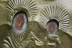 Die in der Abbildung dargestellte Ikone stammt aus der ersten Hälfte des 19. Jh. und stellt die Mutter Gottes und Jesus dar. Die Marien-Ikone ist beinahe vollständig mit einer Messingverkleidung ummantelt, dem sogenannten Oklad, sodass nur die Gesichter der beiden Heiligen zum Vorschein kommen. Das Oklad dient dem Schutz der Bildnisse vor äußeren Einwirkungen, wie beispielsweise dem Ruß darunter stehender Kerzen.