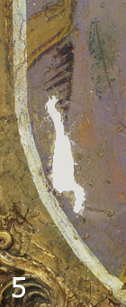 Anschließend wurden die Fehlstellen, welche die Ikone aufwies, mittels Kreide und Hautleim geschlossen sowie egalisiert. Die Retusche an der Ikone erfolgte mit Gouache-Farben (s. Bild 4-6).