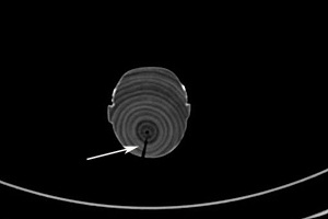 Der zweite Schnitt ist ebenfalls aus der Kopfpartie, jedoch ein Stück weiter unten. Anhand dieser Schicht lassen sich Spannungs-Risse am Rücken der Skulptur erläutern, denn wie man deutlich sieht wurde Holz aus der Mitte eines Stamms zum Schnitzen dieser Skulptur benutzt. Der Markkanal in der Mitte ist deutlich zu erkennen. Durch Trocknung und Schrumpfung des Holzes entstanden Spannungsrisse auf der Rückseite dieser Skulptur.
