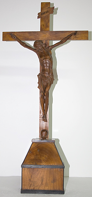 Dieses Holzskulptur wurde als feine Holzschnitzerei gefertigt. Der Corpus Christi ist auf einem schlichten Holzkreuz befestigt. Beide Arme des Christus sind aufgrund der Kreuzigungshaltung abgespreizt und in den Händeinnenflächen sind Nägel angebracht, welche ebenfalls zu Darstellung der Kreuzigung gehören. Der vorgewölbte Brustkorb lässt die Rippenbögen und die Wunde Christi linksseitig erkennen. Die Darstellung des Gesichts und vor allem des Barthaares zeigt eine besonders sensible Schnitzarbeit. Oberhalb des Kopfes ist ein Holzschild mit der Aufschrift „INRI“ (Iesus Nazarenus Rex Iudaeorum) zu erkennen. Die Füße liegen übereinander und sind mit einem Nagel ans Kreuz geheftet. Ein sich nach oben konisch verjüngender Quader bildet den Sockel dieses Kruzifix, welcher an den Verbindungskanten mit einer dünnen schwarzen Holzprofilleiste geschmückt wurde.