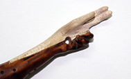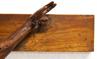 Holzstücke wurden an die Bruchkanten angesetzt. Für diese Arbeit wurde Linde als Schnitzholz gewählt. Mit Hilfe eines Skalpells konnten die fehlende Fingerstücke am Objekt ausgearbeitet werden. Hierbei wurde darauf