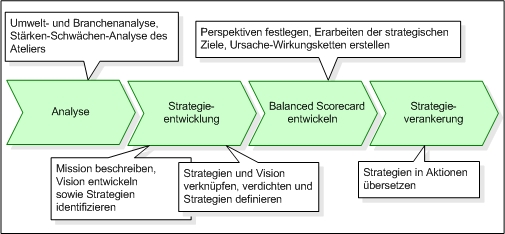 Für die Umsetzung der strategischen Ausrichtung steht die Balanced Scorecard (BSC) zur Verfügung. Die gestaltete BSC spiegelt mit ihren strategischen Zielen, eingebettet in die jeweilige Perspektive, die Gesamtstrategie des Restaurierungs-Ateliers dar.