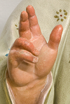 Zum Ersetzten der abgebrochenen Finger des Christuskindes wurden diese aus Gips modelliert und mit einem Skalpell in Form geschnitzt. Um die Stabilität zu erhöhen, wurden zuvor Holzstäbchen gesetzt, die den inneren Kern für die Gipsmasse bildeten.
